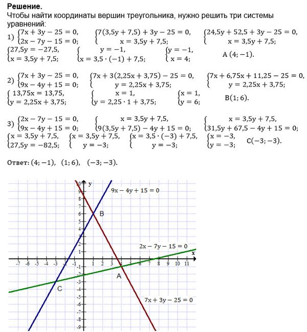 Найдите вершины треугольника если его стороны заданы уравнением 7x+3y-25=0 2x-7y-15=0 9x-4y+15=0 И график рисунок пожалуйста , буду очень благодарна Срочно
