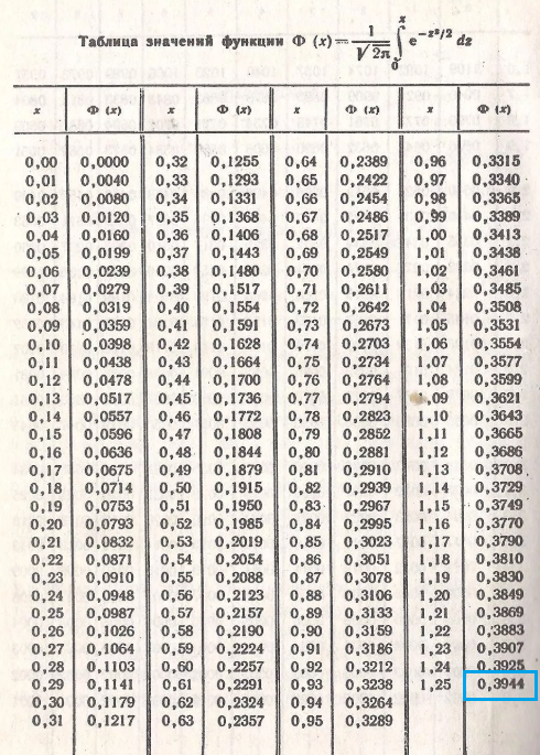Ф(ε/σ)=Ф(2/1,6))=Ф(1,25)=0,3944 ( см. приложение)