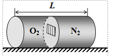 На гладком горизонтальном столе находится цилиндрический сосуд длиной L, разделённый перегородкой на две равные части (см. рисунок). В одной части сосуда находится кислород, а в другой – азот. Давление азота вдвое больше давления кислорода, а температуры одинаковы. В перегородке открывается шторка, в результате чего газы в сосуде перемешиваются. На какое расстояние при этом сдвинется сосуд? Массой сосуда и перегородки пренебречь. Процесс считать изотермическим.