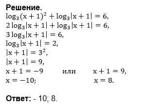 ОДЗ: (x+1)^2>0 ⇒ |x+1| >0 ⇒ x ≠ -1 Так как log_(3)(x+1)^2=2log_(3)|x+1| уравнение принимает вид: 2log_(3)|x+1|+log_(3)|x+1|=6 3log_(3)|x+1|=6 log_(3)|x+1|=2 |x+1|=3^2 |x+1|=9 x+1=-9 или x+1=9 x=-10 или х=8 О т в е т. -10; 8