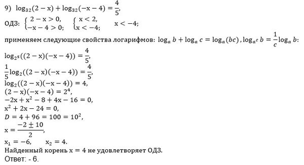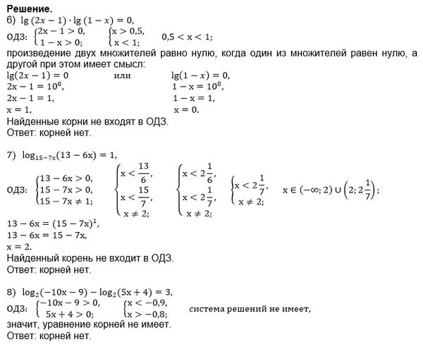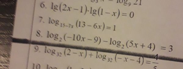 6. lg(2x - 1) · lg(1 - x) = 0 7. log₁₅₋₇ₓ (13 - 6x) = 1 8. log₂(-10x - 9) - log₂(5x + 4) = 3 9. log₃₂ (2 - x) + log₃₂(-x - 4) = ⅘