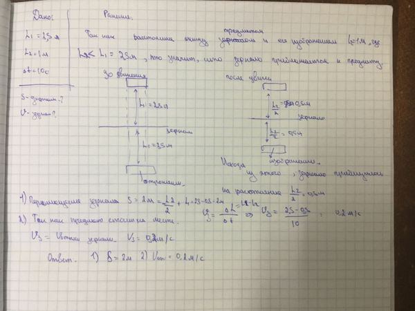 Плоское зеркало, которое находится на расстоянии 2,5 м от предмета, начинают равномерно перемещаться и через 10 с движения расстояние между предметом и его изображением составляла 100 см. Определить перемещение зеркала и скорость движения изображения относительно предмета.
