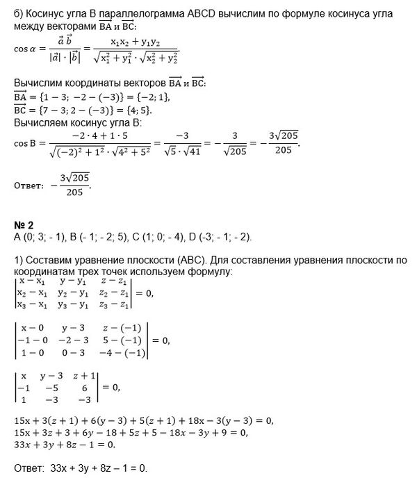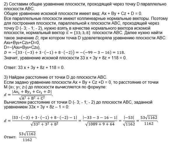 2) общее уравнение плоскости, проходящей через точку D параллельно плоскости АВС;