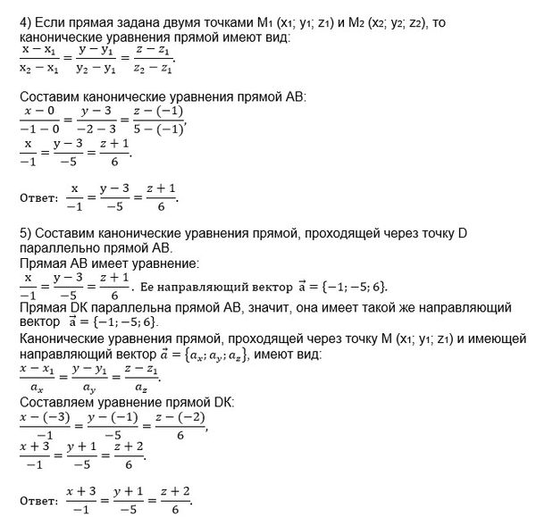 5) канонические уравнения прямой, проходящей через точку D параллельно прямой AB;
