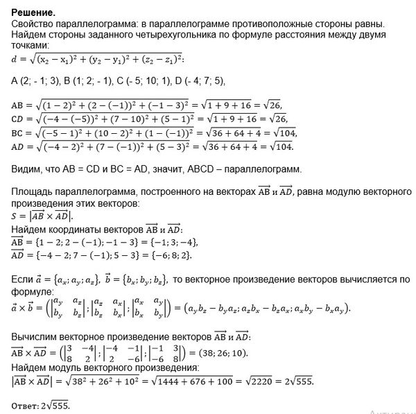 7. Является ли четырехугольник с вершинами в точках A(2, -1, 3), B(1, 2, -1), D(-4, 7, 5) и C(-5, 10, 1) параллелограммом? Если - да, то найти его площадь.