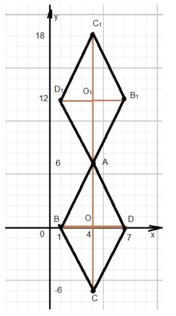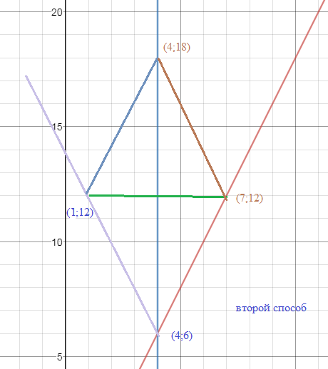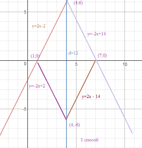 Строим прямую y=-2x+14 симметричную прямой y=2x-2 относительно прямой х=4 Далее из условия. Откладываем длину d=14 Вторая диагональ ромба имеет длину 6 S=(1/2)d_(1)*d_(2)=(1/2)*12*6=36