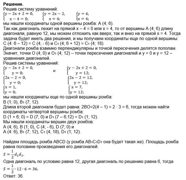10. Найти площадь ромба и координаты его вершин, если одна из его сторон и одна из диагоналей лежат соответственно на прямых L₁: y - 2x + 2 = 0 и L₂: x - 4 = 0, а длина диагонали равна 12. Сколько решений имеет задача?