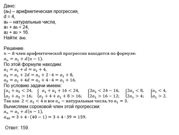 Сумма первого и пятого членов арифметической прогрессии, все члены которой натуральные числа, меньше 24, а сумма второго и третьего членов больше 16. Найти сороковой член этой прогрессии, если разность равна 4