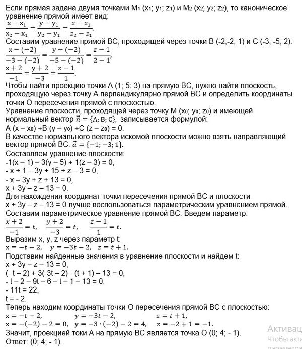 Найти координаты проекции точки А = (1,5,3) на прямую, проходящую через точки В = (-2, -2,1) и С = (-3,-5,2).