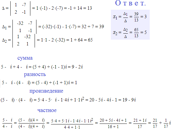 2. Решить систему линейных уравнений методом Крамера: {x-7y=-32 {2x-y=1 3. Найти сумму, разность, произведение и частное двух комплексных чисел z1=5-i, z2=4-i