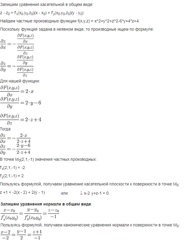 Найти уравнение касательной плоскости и нормали к заданной поверхности S в точке M0(x0,y0,z0) 1.6 S: x^2+y^2+z^2-6y+4z+4=0, M0(2,1,-1). Вариант 1.6