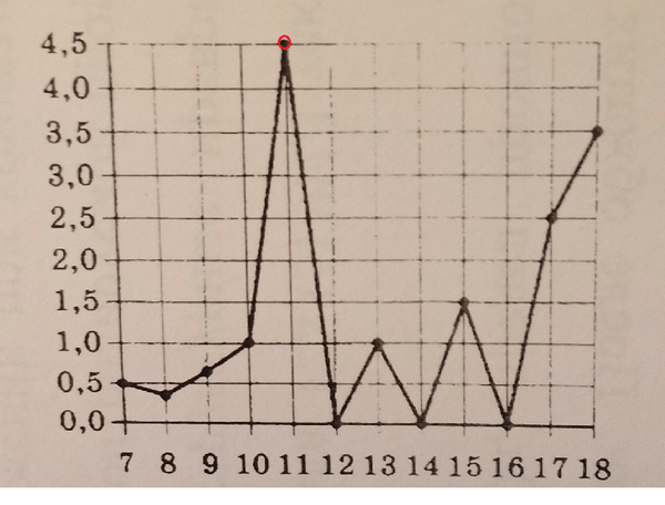 На рисунке жирными точками показано суточное количество осадков, выпадавших в Элисте с 7 по 18 декабря 2001 года. По горизонтали указываются числа месяца, по вертикали — количество осадков, выпавших в соответствующий день, в миллиметрах. Для наглядности жирные точки на рисунке соединены линией. Определите по рисунку, какого числа из данного периода в Элисте выпало наибольшее количество осадков.