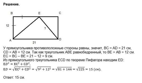 На стороне BC прямоугольника ABCD,у которого AB = 12 см и AD = 21 см, отмечена точка E так, что треугольник ABC равнобедренный. Найдите ED.