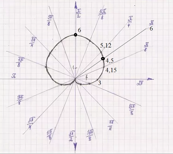 φ=π/8 ⇒ ρ =3*(1+sinπ/8)=3*(1+0,3826)≈ 4,15