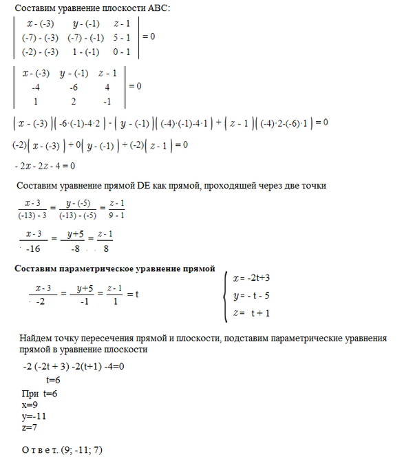 Найти координаты точки пересечения плоскости, проходящей через точки А=(-3,-1,1), В=(-7,-7,5),С=(-2,1,0) с прямой, проходящей через точки D=(3,-5,1), Е=(-13,-13,9).