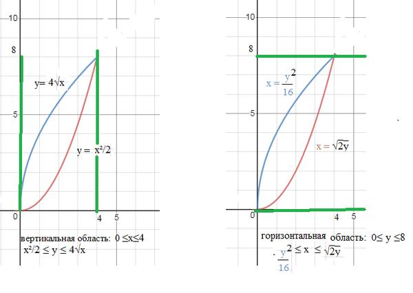 0 ≤ x ≤ 4; x^2/2 ≤ y ≤ 4sqrt(x)