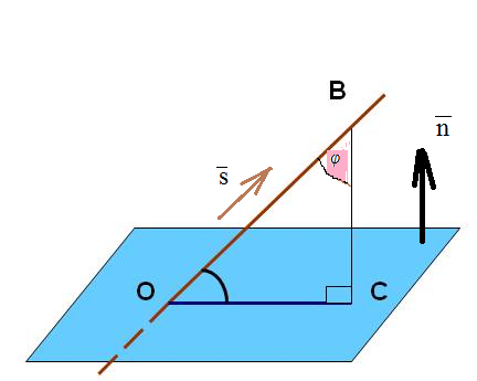 Легко найти угол между направляющим вектором прямой и нормальным вектором плоскости.