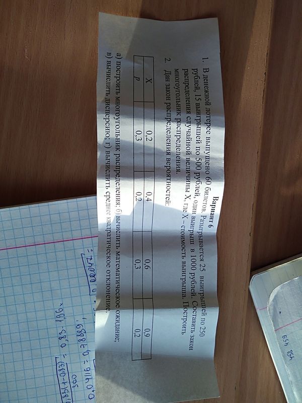 1. В денежной лотерее выпущено 60 билетов по 25 рублей. Распределяется 25 выигpышей по 250 рублей, 15 выигpышей по 500 рублей и 6 выигpышей в 1000 рублей. Составить закон распределения случайной величины Χ, где Χ - стоимость выигрыша. Построить многoугольник распределения.