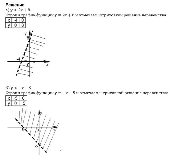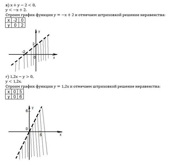 Постройте график неравенства: а) y<2x+8; б) y>-x-5; в) x+y-2<0; г) 1,2x-y>0.