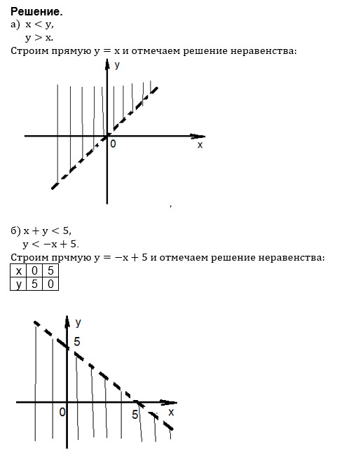 Покажите штриховкой множество точек координатной плоскости, у которых: а) абсцисса меньше, чем ордината; б) сумма координат меньше 5.