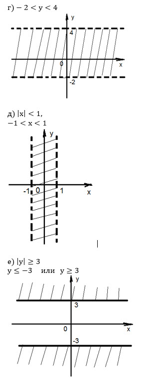 Изобразите на координатной плоскости множество точек с координатами (х;у), для которых: а) x>4; б) y<3,5; в) 1<x<5; г) -2<y<4; д) |x| <1; е) |y| ≥ 3.
