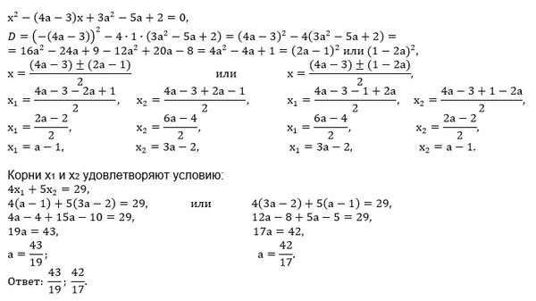 Найти все значения параметра а, при которых x1 и x2 являются корнями квадратного уравнения х^2-(4а-3)х+3а^2-5а+2=0 и 4x1+5x2 = 29 .