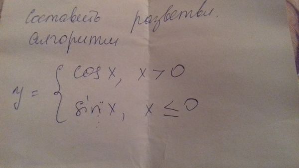 составить разветвл алгоритмы y = { cos x, x>0 { sin x, x ≤ 0
