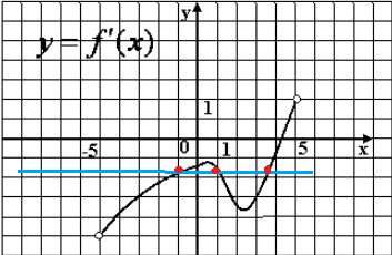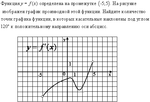 k(касательной)= f `(x_(o)) = tg α α =120 градусов ⇒ tg α = - sqrt(3) Найдем сколько точек на графике, в которых f `(x) =- sqrt(3) Проводим прямую y= - sqrt(3) и смотрим сколько точек пересечения эта прямая имеет с графиком y= f ` (x) О т в е т. Три точки