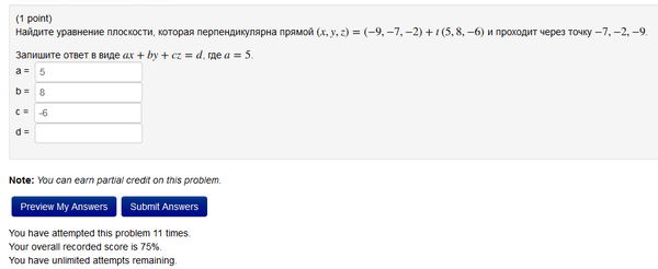 Запишите ответ в виде ax + by + cz = d, где a = 5.