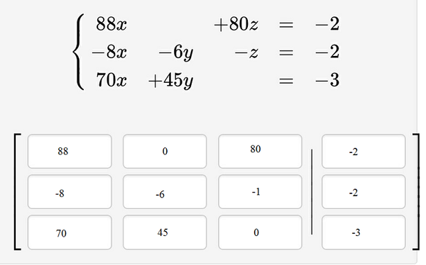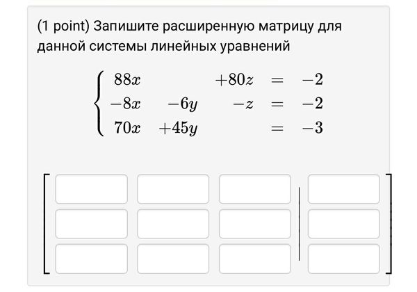 (1 point) Запишите расширенную матрицу для данной системы линейных уравнений 88x + 80z = -2 -8x - 6y - z = -2 70x + 45y = -3