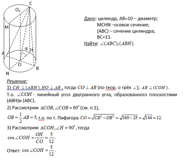 В цилиндре отрезок AB является диаметром нижнего основания и равен 10. Точка С лежит на окружности верхнего основания цилиндра и одновременно принадлежит осевому сечению цилиндра, перпендикулярного AB. Найти косинус угла между плоскостью (ABC) и плоскостью основания цилиндра, если BC=13.