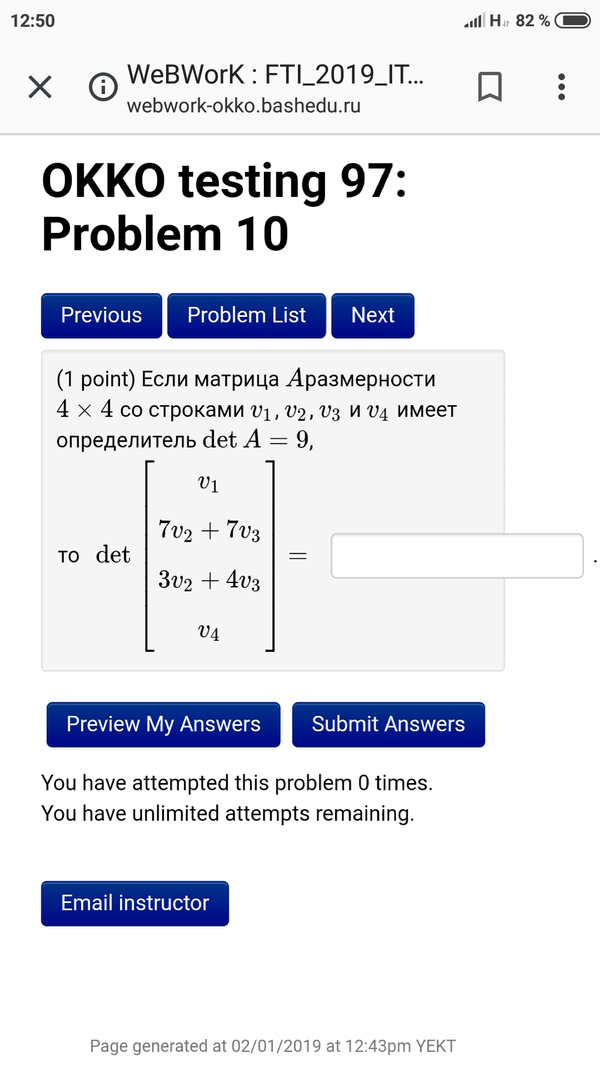 Если матрица A размерности 4 x 4 со строками v1, v2, v3 и v4 имеет определитель det A = 9