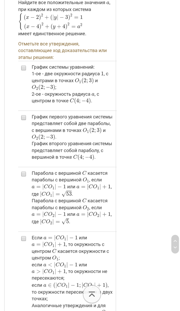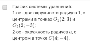 Найдите все положительные значения а, при каждом из которых система { (x - 2)^2 + (|y| - 3)^2 = 1 { (x - 4)^2 + (y + 4)^2 = a^2 имеет единственное решение.