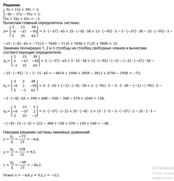 Решите систему линейных уравнений, используя правило Крамера 3x + 15y + 38z = 2 -8x - 37y - 95z = 2 5x + 25y + 65z = -2 det = x = y = z =