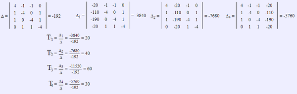T₁ = (T₂ + T₃ + 0 - 20)/4.