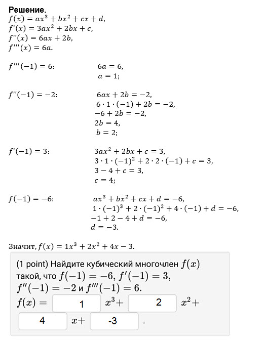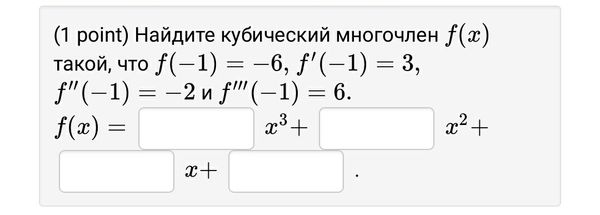 (1 point) Найдите кубический многочлен f(x) такой, что f(-1) = -6, f'(-1) = 3, f''(-1) = -2 и f'''(-1) = 6.