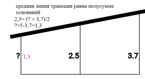 Наклонная крыша установлена на трёх вертикальных опорах, основания которых расположены на одной прямой. Средняя опора стоит посередине между малой и большой опорами. Высота большой опоры 3,7 м, высота средней опоры 2,5 м. Найдите высоту малой опоры. Ответ дайте в метрах.