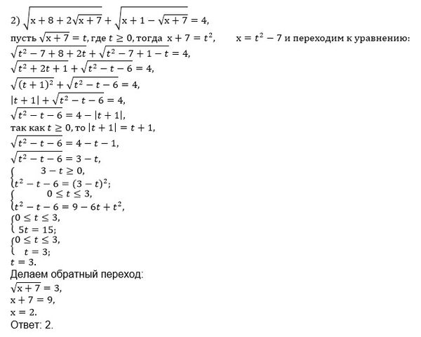 2) sqrt(х+8+2 sqrt(х+7))+ sqrt(х+1-sqrt(х+7))=4