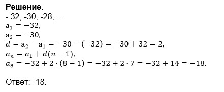 a1 = -32 a2 = -30 d = a2-a1 =-30+32 = 2 a8 = a1+(8-1)*d = -32+7*2 = -32+14 = -18 Ответ : -18