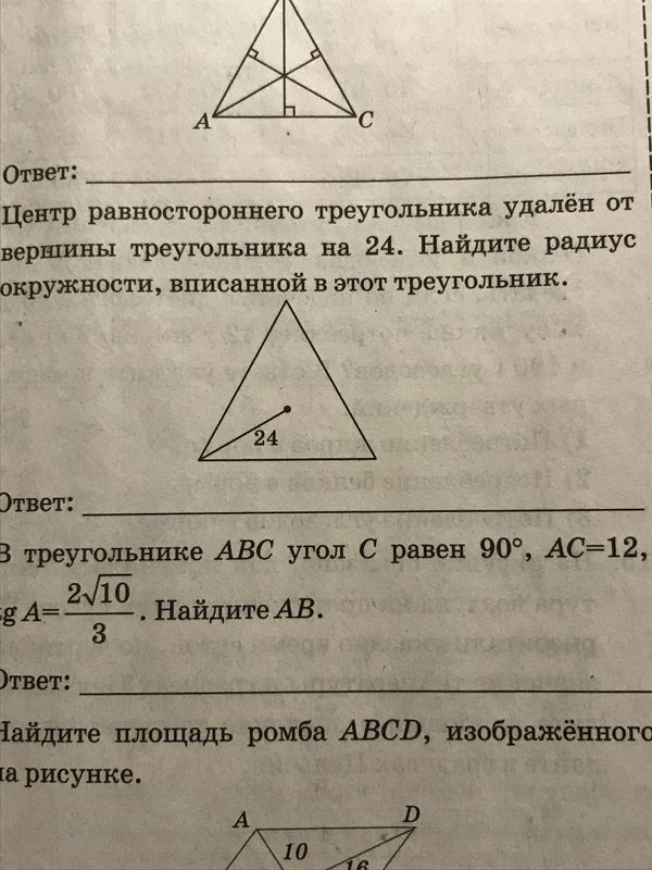 Центр равностороннего треугольника удалён от вершины треугольника на 24. Найдите радиус окружности, вписанной в этот треугольник.