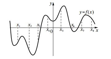 На рисунке изображён график функции y=f(x). На оси абсцисс отмечены восемь точек: x1 ,x2, x3, x4 , x5 , x6 , x7 , x8 . В скольких из этих точек производная функции f(x) отрицательна?