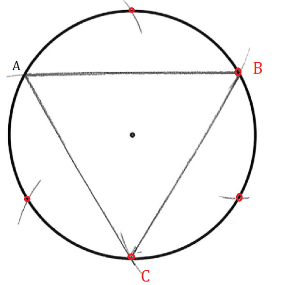 Выберем произвольную вершину А на окружности. Из нее радиусом, равным радиусу окружности, делаем засечки на окружности и получаем вершины А,В,С,D, E, F (красного цвета на рисунке) которые соединим отрезками. Получим правильный шестиугольник.