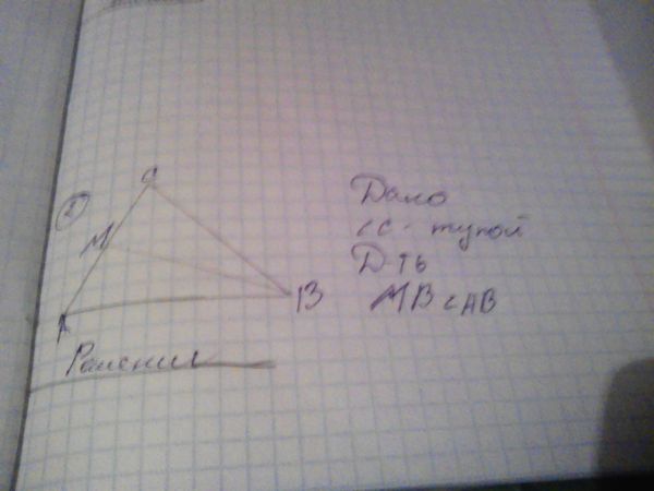 Так как в треугольнике АВС угол С тупой, то углы А и В - острые. В Δ АМВ угол М тоже тупой, а угол А - острый. В треугольнике против большего угла лежит большая сторона. Значит, сторона МВ, лежащая против острого угла А, меньше стороны АВ, лежащей против тупого угла М.