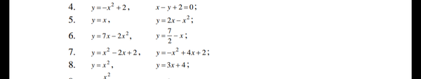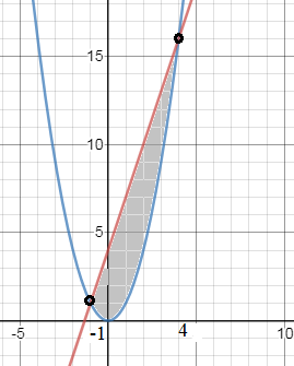 x^2=3x+4 x^2-3x-4=0 D=9+16=25 х=(3-5)/2=-1 или х=(3+5).2=4 S= ∫ ^(4)_(1) ((3x+4)-x^2)dx= =((3x^2/2)+(4x)- (x^3/3))|^(4)_(-1)= =(3/2)*(4^2-(-1)^2) +4*(4-(-1))-(1/3)*(4^3-(-1)^3)= =68 целых 5/6