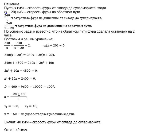 От продовольственного склада до супермаркета, расстояние между которыми 240 км, с постоянной скоростью выехала фура. На следующий день она отправилась обратно со скоростью на 20 км/ч больше прежней. По дороге фура сделала остановку на 2 часа. В результате она затратила на обратный путь столько же времени, сколько на путь до супермаркета. Найдите скорость фуры по пути от продовольственного склада до супермаркета. Ответ дайте в км/ч.
