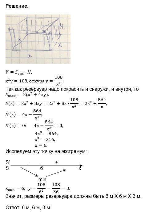 Резервуар емкостью 108 м3 с квадратным основанием, открытый сверху, нужно покрыть эмалью. Каковы должны быть размеры резервуара, чтобы израсходовать для этого минимальное количество эмали?