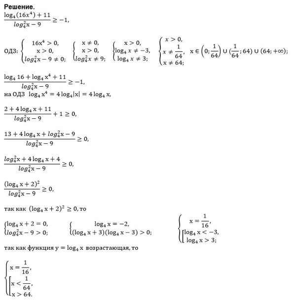 (log4(16x^4)+11)/(log^2_(4)x-9) больше или равно -1