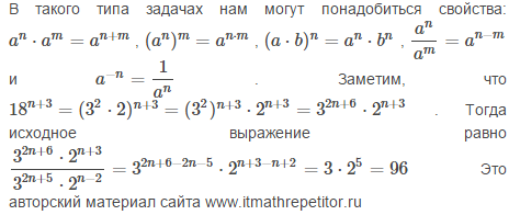 18^(n 3)/ 3^(2n 5)*2^(n-2)=18^n*18^3/9^n*3^5*2^n*2^(-2)=18^3*2^2/3^5=(3^2*2)^3*2^2/3^5=3^6*2^5/3^5=3*2^5=3*32=96. Ответ: 96