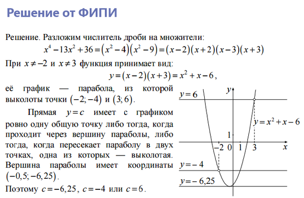 Постройте график функции y=(x^4-13x^2+36)/((x-3)(x+2)) и определите, при каких значениях c прямая y=c имеет с графиком ровно одну общую точку.