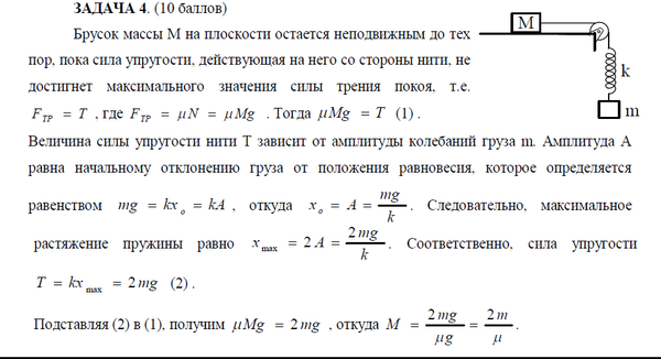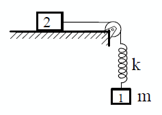 Груз массы m подвешен через пружину жёсткости k на нерастяжимой нити, перекинутой через блок, соединённой с бруском 2, лежащим на горизонтальной плоскости. В начальный момент груз m удерживается так, что пружина находится в ненапряжённом состоянии, затем его отпускают без начальной скорости. Найдите минимальную массу бруска 2, при которой он ещё будет оставаться неподвижным. Коэффициент трения между бруском 2 плоскостью равен µ. Массой пружины, нити, блока и трением в нём пренебречь.